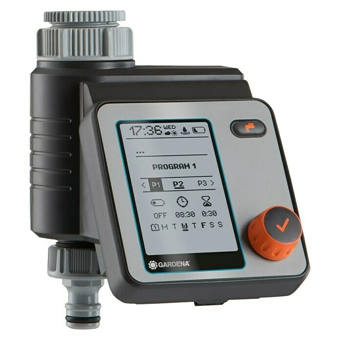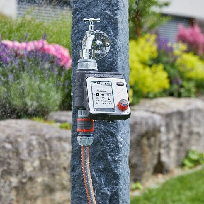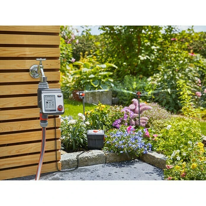 Met de Gardena besproeiingscomputer Master kun je het besproeien van je tuin flexibel en op maat plannen. Met deze computer kun je maximaal zes verschillende en onafhankelijke tijdschema’s voor besproeiing instellen. Je stelt de starttijd, de duur en de weekdagen in. De besproeiingscomputer is rechtstreeks op een kraan aangesloten en werkt op batterijen (levering zonder batterijen). Hij heeft een gemakkelijk af te lezen, volledig grafisch lcd-display. De menunavigatie is in 10 talen instelbaar. Als het weer verandert, kun je de besproeiingsduur centraal in stappen van 10% verkorten of de besproeiing 1 tot 7 dagen onderbreken. Met de functie “Water Now” kun je de besproeiing meteen starten zonder het apparaat los te koppelen van de kraan. Als de batterij bijna leeg is, wordt het besproeiingsproces niet gestart. De batterij-indicator op het display geeft tijdig aan wanneer je de batterij moet vervangen. Dit apparaat is ideaal voor het aansturen van de Gardena automatische waterverdeler. Je kunt dit apparaat ook gebruiken in combinatie met de Gardena bodemvochtigheidssensor.
