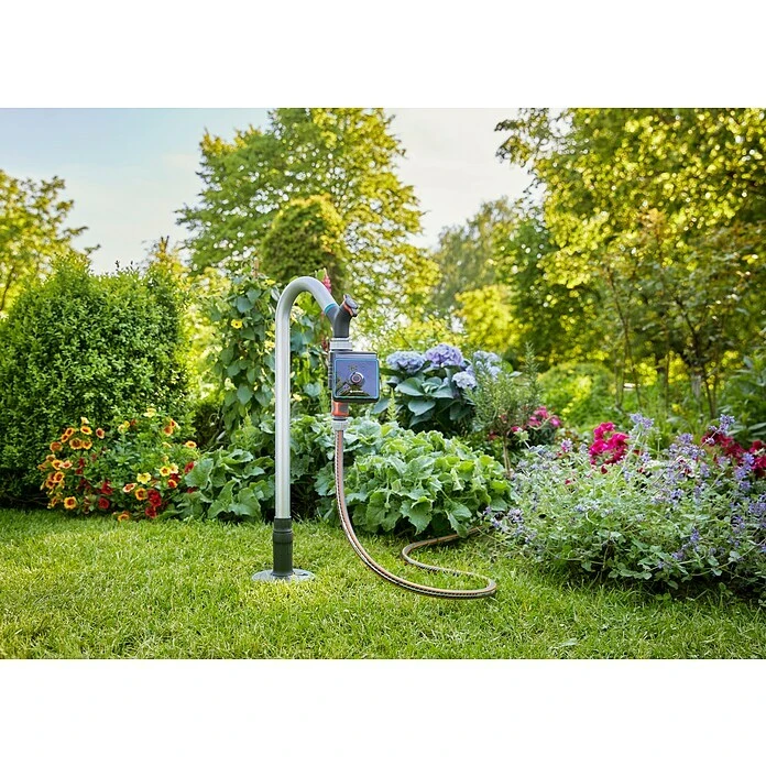 Hij kan ook flexibel worden gedraaid, wat de bediening vergemakkelijkt. Zelfs zonder aangesloten slang is de wateronttrekking spatvrij dankzij anti-spat. Materialen zoals de aluminium buis geven de in Duitsland ontwikkelde hoogwaardige tuinkraan een lange levensduur en een hoge robuustheid.