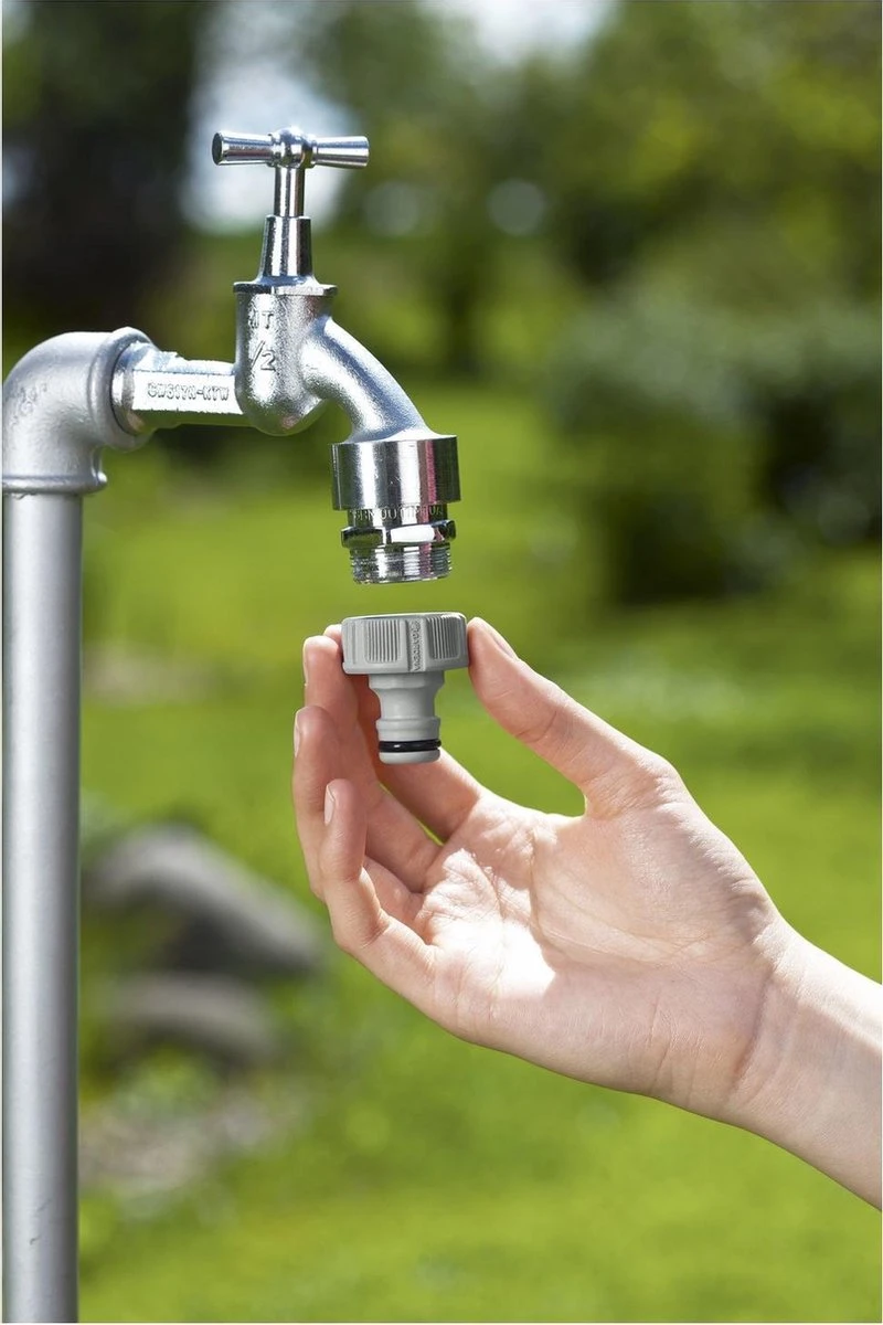 Dit GARDENA kraanstuk garandeert een vaste verbinding tussen de kraan en de slang. Eenvoudig en comfortabel in gebruik dankzij de speciale vorm van het kraanstuk. Het GARDENA kraanstuk kan worden aangesloten op kranen met 21 mm (G 1/2″) draad.