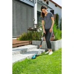 De GARDENA set met telescopische steel en wielen vergemakkelijkt het nauwkeurig snijden van graskanten of bodembedekking terwijl je rechtop staat en zonder dat je hoeft te bukken. Dankzij de kabelloze plug-in-aansluiting is het monteren op de accugrasschaar zeer eenvoudig. Tijdens het werk ligt de ergonomische handgreep perfect in de hand en kan de machine eenvoudig van boven worden bediend. De steel kan worden aangepast van 74 tot 96 cm om optimaal te passen bij de gebruikershoogte en werksituatie. De plug-on wielen maken een eenvoudige geleiding van de accugrasschaar over het gras mogelijk.