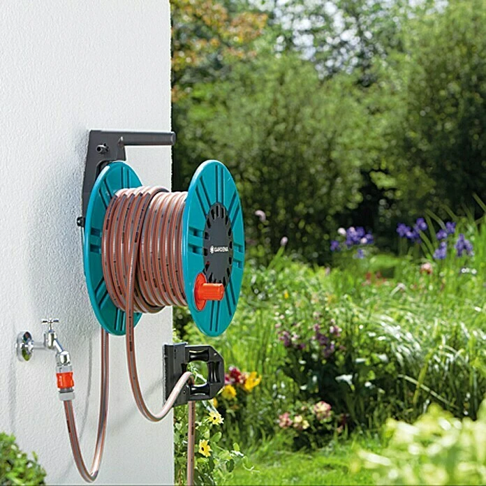 Je kunt je tuinslang eenvoudig opbergen met de GARDENA Classic wandslanghaspel 60 met slanggeleiderrol. Dankzij de slanggeleiderrol kun je de slang gemakkelijk op- en afrollen. De schuine aansluitas voorkomt knikken van de slang. De slang kan na het bewateren op de druppelstop aan de voorkant worden gestoken. Er wordt dus geen water verspild. De trommel kan na het bewateren eenvoudig uit de duurzame metalen houder worden gehaald. De geïntegreerde draaggreep maakt het vervoeren nog gemakkelijker.
