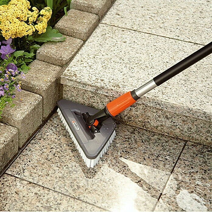 De GARDENA zwenkschrobber is uitgerust met het Original GARDENA System, waarmee je hem op een watertoevoer kunt aansluiten. Met zijn driehoekige vorm is deze schrobber ideaal voor moeilijk toegankelijke plaatsen. Je kunt er moeiteloos nauwe ruimtes en hoeken mee schoonmaken waar je met andere borstels of schrobbers moeilijk bij kunt. Het draaischarnier draagt hieraan bij, omdat de schrobber hierdoor 360° kan draaien. Bovendien is hij met alle waterstelen van het Original GARDENA Cleansystem te gebruiken. Dankzij de sterke haren is deze zwenkschrobber ideaal voor het schoonmaken van robuuste vloeroppervlakken, zoals terrassen of trappen.